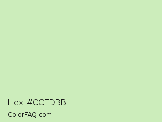 Hex #ccedbb Color is a very light green color and the nearest color is Tea Green #d0f0c0. Hex code #ccedbb and RGB value is rgb(204,237,187). In RGB color space, this color is composed of 80% red, 93% green, 73% blue, In CMYK color space, this color is composed of 14% cyan, 0% magenta, 21% yellow , 7% black , In HSL color space, this color has a hue angle of 100° , 58% saturation and 83% lightness.