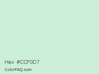 Hex #ccf0d7 Color is a very light green color and the nearest color is Skeptic #cae6da. Hex code #ccf0d7 and RGB value is rgb(204,240,215). In RGB color space, this color is composed of 80% red, 94% green, 84% blue, In CMYK color space, this color is composed of 15% cyan, 0% magenta, 10% yellow , 6% black , In HSL color space, this color has a hue angle of 138° , 55% saturation and 87% lightness.