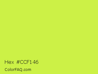 Hex #ccf146 Color is a light lime color and the nearest color is Maximum Green Yellow #d9e650. Hex code #ccf146 and RGB value is rgb(204,241,70). In RGB color space, this color is composed of 80% red, 95% green, 27% blue, In CMYK color space, this color is composed of 15% cyan, 0% magenta, 71% yellow , 5% black , In HSL color space, this color has a hue angle of 73° , 86% saturation and 61% lightness.