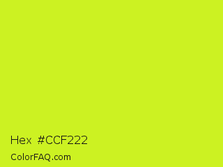 Hex #ccf222 Color is a normal lime color and the nearest color is Arctic Lime #d0ff14. Hex code #ccf222 and RGB value is rgb(204,242,34). In RGB color space, this color is composed of 80% red, 95% green, 13% blue, In CMYK color space, this color is composed of 16% cyan, 0% magenta, 86% yellow , 5% black , In HSL color space, this color has a hue angle of 71° , 89% saturation and 54% lightness.