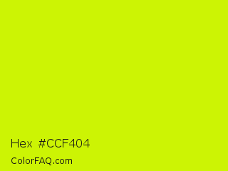 Hex #ccf404 Color is a normal yellow color and the nearest color is Electric Lime #ccff00. Hex code #ccf404 and RGB value is rgb(204,244,4). In RGB color space, this color is composed of 80% red, 96% green, 2% blue, In CMYK color space, this color is composed of 16% cyan, 0% magenta, 98% yellow , 4% black , In HSL color space, this color has a hue angle of 70° , 97% saturation and 49% lightness.