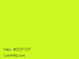 Hex #ccf71f Color is a normal lime color and the nearest color is Arctic Lime #d0ff14. Hex code #ccf71f and RGB value is rgb(204,247,31). In RGB color space, this color is composed of 80% red, 97% green, 12% blue, In CMYK color space, this color is composed of 17% cyan, 0% magenta, 87% yellow , 3% black , In HSL color space, this color has a hue angle of 72° , 93% saturation and 55% lightness.