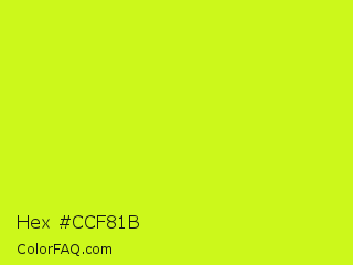 Hex #ccf81b Color is a normal lime color and the nearest color is Arctic Lime #d0ff14. Hex code #ccf81b and RGB value is rgb(204,248,27). In RGB color space, this color is composed of 80% red, 97% green, 11% blue, In CMYK color space, this color is composed of 18% cyan, 0% magenta, 89% yellow , 3% black , In HSL color space, this color has a hue angle of 72° , 94% saturation and 54% lightness.