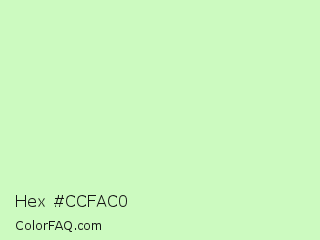 Hex #ccfac0 Color is a very light green color and the nearest color is Tea Green #d0f0c0. Hex code #ccfac0 and RGB value is rgb(204,250,192). In RGB color space, this color is composed of 80% red, 98% green, 75% blue, In CMYK color space, this color is composed of 18% cyan, 0% magenta, 23% yellow , 2% black , In HSL color space, this color has a hue angle of 108° , 85% saturation and 87% lightness.