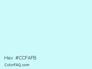Hex #ccfafb Color is a very light cyan color and the nearest color is Onahau #cdf4ff. Hex code #ccfafb and RGB value is rgb(204,250,251). In RGB color space, this color is composed of 80% red, 98% green, 98% blue, In CMYK color space, this color is composed of 19% cyan, 0% magenta, 0% yellow , 2% black , In HSL color space, this color has a hue angle of 181° , 85% saturation and 89% lightness.