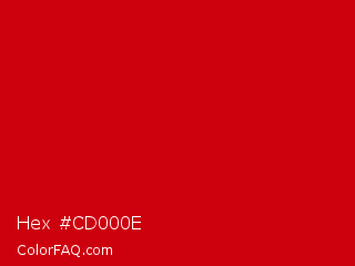 Hex #cd000e Color is a normal red color and the nearest color is Harvard Crimson #c90016. Hex code #cd000e and RGB value is rgb(205,0,14). In RGB color space, this color is composed of 80% red, 0% green, 5% blue, In CMYK color space, this color is composed of 0% cyan, 100% magenta, 93% yellow , 20% black , In HSL color space, this color has a hue angle of 356° , 100% saturation and 40% lightness.