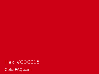 Hex #cd0015 Color is a normal red color and the nearest color is Harvard Crimson #c90016. Hex code #cd0015 and RGB value is rgb(205,0,21). In RGB color space, this color is composed of 80% red, 0% green, 8% blue, In CMYK color space, this color is composed of 0% cyan, 100% magenta, 90% yellow , 20% black , In HSL color space, this color has a hue angle of 354° , 100% saturation and 40% lightness.