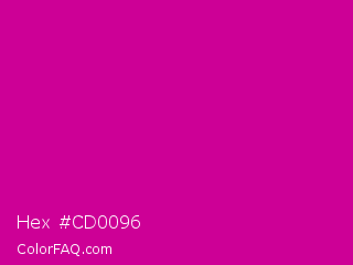 Hex #cd0096 Color is a normal magenta color and the nearest color is Red Violet #c71585. Hex code #cd0096 and RGB value is rgb(205,0,150). In RGB color space, this color is composed of 80% red, 0% green, 59% blue, In CMYK color space, this color is composed of 0% cyan, 100% magenta, 27% yellow , 20% black , In HSL color space, this color has a hue angle of 316° , 100% saturation and 40% lightness.
