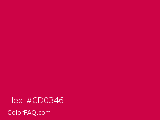 Hex #cd0346 Color is a normal rose color and the nearest color is Spanish Carmine #d10047. Hex code #cd0346 and RGB value is rgb(205,3,70). In RGB color space, this color is composed of 80% red, 1% green, 27% blue, In CMYK color space, this color is composed of 0% cyan, 99% magenta, 66% yellow , 20% black , In HSL color space, this color has a hue angle of 340° , 97% saturation and 41% lightness.