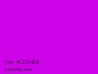 Hex #cd04e8 Color is a normal magenta color and the nearest color is Vivid Mulberry #b80ce3. Hex code #cd04e8 and RGB value is rgb(205,4,232). In RGB color space, this color is composed of 80% red, 2% green, 91% blue, In CMYK color space, this color is composed of 12% cyan, 98% magenta, 0% yellow , 9% black , In HSL color space, this color has a hue angle of 293° , 97% saturation and 46% lightness.