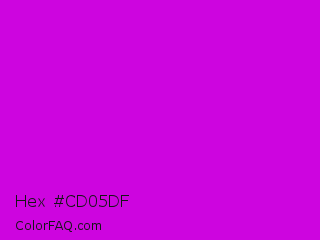Hex #cd05df Color is a normal magenta color and the nearest color is Deep Magenta #cc00cc. Hex code #cd05df and RGB value is rgb(205,5,223). In RGB color space, this color is composed of 80% red, 2% green, 87% blue, In CMYK color space, this color is composed of 8% cyan, 98% magenta, 0% yellow , 13% black , In HSL color space, this color has a hue angle of 295° , 96% saturation and 45% lightness.