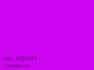 Hex #cd05f1 Color is a normal purple color and the nearest color is Vivid Orchid #cc00ff. Hex code #cd05f1 and RGB value is rgb(205,5,241). In RGB color space, this color is composed of 80% red, 2% green, 95% blue, In CMYK color space, this color is composed of 15% cyan, 98% magenta, 0% yellow , 5% black , In HSL color space, this color has a hue angle of 291° , 96% saturation and 48% lightness.