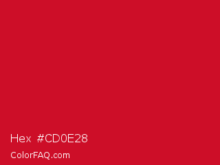 Hex #cd0e28 Color is a normal red color and the nearest color is Lava #cf1020. Hex code #cd0e28 and RGB value is rgb(205,14,40). In RGB color space, this color is composed of 80% red, 5% green, 16% blue, In CMYK color space, this color is composed of 0% cyan, 93% magenta, 80% yellow , 20% black , In HSL color space, this color has a hue angle of 352° , 87% saturation and 43% lightness.