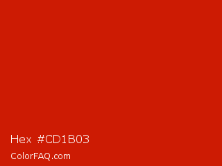 Hex #cd1b03 Color is a normal red color and the nearest color is International Orange Engineering #ba160c. Hex code #cd1b03 and RGB value is rgb(205,27,3). In RGB color space, this color is composed of 80% red, 11% green, 1% blue, In CMYK color space, this color is composed of 0% cyan, 87% magenta, 99% yellow , 20% black , In HSL color space, this color has a hue angle of 7° , 97% saturation and 41% lightness.