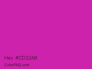 Hex #cd22ab Color is a normal magenta color and the nearest color is Byzantine #bd33a4. Hex code #cd22ab and RGB value is rgb(205,34,171). In RGB color space, this color is composed of 80% red, 13% green, 67% blue, In CMYK color space, this color is composed of 0% cyan, 83% magenta, 17% yellow , 20% black , In HSL color space, this color has a hue angle of 312° , 72% saturation and 47% lightness.