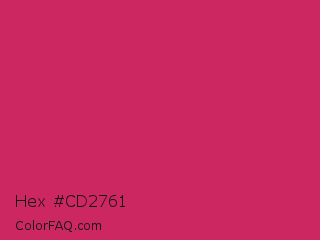 Hex #cd2761 Color is a normal rose color and the nearest color is Rose Red #c21e56. Hex code #cd2761 and RGB value is rgb(205,39,97). In RGB color space, this color is composed of 80% red, 15% green, 38% blue, In CMYK color space, this color is composed of 0% cyan, 81% magenta, 53% yellow , 20% black , In HSL color space, this color has a hue angle of 339° , 68% saturation and 48% lightness.