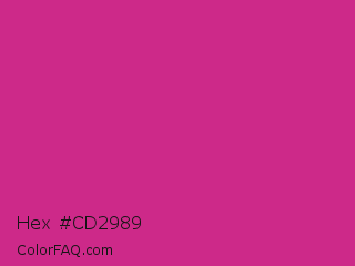 Hex #cd2989 Color is a normal magenta color and the nearest color is Royal Fuchsia #ca2c92. Hex code #cd2989 and RGB value is rgb(205,41,137). In RGB color space, this color is composed of 80% red, 16% green, 54% blue, In CMYK color space, this color is composed of 0% cyan, 80% magenta, 33% yellow , 20% black , In HSL color space, this color has a hue angle of 325° , 67% saturation and 48% lightness.