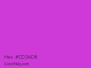 Hex #cd3ad8 Color is a normal magenta color and the nearest color is Steel Pink #cc33cc. Hex code #cd3ad8 and RGB value is rgb(205,58,216). In RGB color space, this color is composed of 80% red, 23% green, 85% blue, In CMYK color space, this color is composed of 5% cyan, 73% magenta, 0% yellow , 15% black , In HSL color space, this color has a hue angle of 296° , 67% saturation and 54% lightness.