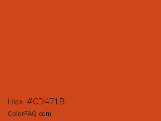 Hex #cd471b Color is a normal color and the nearest color is Sinopia #cb410b. Hex code #cd471b and RGB value is rgb(205,71,27). In RGB color space, this color is composed of 80% red, 28% green, 11% blue, In CMYK color space, this color is composed of 0% cyan, 65% magenta, 87% yellow , 20% black , In HSL color space, this color has a hue angle of 15° , 77% saturation and 45% lightness.