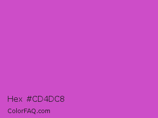 Hex #cd4dc8 Color is a normal magenta color and the nearest color is Fuchsia Pink #c154c1. Hex code #cd4dc8 and RGB value is rgb(205,77,200). In RGB color space, this color is composed of 80% red, 30% green, 78% blue, In CMYK color space, this color is composed of 0% cyan, 62% magenta, 2% yellow , 20% black , In HSL color space, this color has a hue angle of 302° , 56% saturation and 55% lightness.