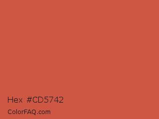 Hex #cd5742 Color is a normal red color and the nearest color is Dark Coral #cd5b45. Hex code #cd5742 and RGB value is rgb(205,87,66). In RGB color space, this color is composed of 80% red, 34% green, 26% blue, In CMYK color space, this color is composed of 0% cyan, 58% magenta, 68% yellow , 20% black , In HSL color space, this color has a hue angle of 9° , 58% saturation and 53% lightness.
