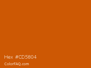 Hex #cd5804 Color is a normal orange color and the nearest color is Tenn #cd5700. Hex code #cd5804 and RGB value is rgb(205,88,4). In RGB color space, this color is composed of 80% red, 35% green, 2% blue, In CMYK color space, this color is composed of 0% cyan, 57% magenta, 98% yellow , 20% black , In HSL color space, this color has a hue angle of 25° , 96% saturation and 41% lightness.