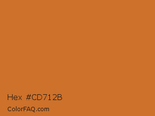 Hex #cd712b Color is a normal orange color and the nearest color is Ochre #cc7722. Hex code #cd712b and RGB value is rgb(205,113,43). In RGB color space, this color is composed of 80% red, 44% green, 17% blue, In CMYK color space, this color is composed of 0% cyan, 45% magenta, 79% yellow , 20% black , In HSL color space, this color has a hue angle of 26° , 65% saturation and 49% lightness.