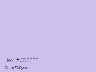 Hex #cdbfee Color is a very light indigo color and the nearest color is Soap #cec8ef. Hex code #cdbfee and RGB value is rgb(205,191,238). In RGB color space, this color is composed of 80% red, 75% green, 93% blue, In CMYK color space, this color is composed of 14% cyan, 20% magenta, 0% yellow , 7% black , In HSL color space, this color has a hue angle of 258° , 58% saturation and 84% lightness.