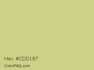 Hex #cdd187 Color is a light yellow color and the nearest color is Pine Glade #c7cd90. Hex code #cdd187 and RGB value is rgb(205,209,135). In RGB color space, this color is composed of 80% red, 82% green, 53% blue, In CMYK color space, this color is composed of 2% cyan, 0% magenta, 35% yellow , 18% black , In HSL color space, this color has a hue angle of 63° , 45% saturation and 67% lightness.