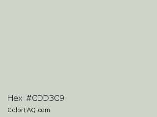 Hex #cdd3c9 Color is a very light green color and the nearest color is Celeste #d1d2ca. Hex code #cdd3c9 and RGB value is rgb(205,211,201). In RGB color space, this color is composed of 80% red, 83% green, 79% blue, In CMYK color space, this color is composed of 3% cyan, 0% magenta, 5% yellow , 17% black , In HSL color space, this color has a hue angle of 96° , 10% saturation and 81% lightness.