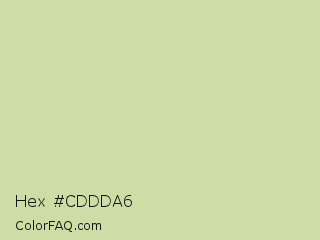 Hex #cddda6 Color is a light lime color and the nearest color is Green Mist #cbd3b0. Hex code #cddda6 and RGB value is rgb(205,221,166). In RGB color space, this color is composed of 80% red, 87% green, 65% blue, In CMYK color space, this color is composed of 7% cyan, 0% magenta, 25% yellow , 13% black , In HSL color space, this color has a hue angle of 77° , 45% saturation and 76% lightness.