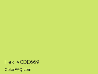 Hex #cde669 Color is a light lime color and the nearest color is Booger Buster #dde26a. Hex code #cde669 and RGB value is rgb(205,230,105). In RGB color space, this color is composed of 80% red, 90% green, 41% blue, In CMYK color space, this color is composed of 11% cyan, 0% magenta, 54% yellow , 10% black , In HSL color space, this color has a hue angle of 72° , 71% saturation and 66% lightness.