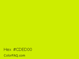 Hex #cded00 Color is a normal yellow color and the nearest color is Volt #ceff00. Hex code #cded00 and RGB value is rgb(205,237,0). In RGB color space, this color is composed of 80% red, 93% green, 0% blue, In CMYK color space, this color is composed of 14% cyan, 0% magenta, 100% yellow , 7% black , In HSL color space, this color has a hue angle of 68° , 100% saturation and 46% lightness.