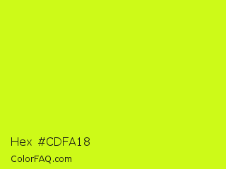 Hex #cdfa18 Color is a normal lime color and the nearest color is Arctic Lime #d0ff14. Hex code #cdfa18 and RGB value is rgb(205,250,24). In RGB color space, this color is composed of 80% red, 98% green, 9% blue, In CMYK color space, this color is composed of 18% cyan, 0% magenta, 90% yellow , 2% black , In HSL color space, this color has a hue angle of 72° , 96% saturation and 54% lightness.