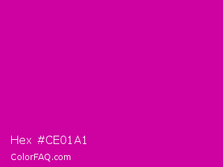 Hex #ce01a1 Color is a normal magenta color and the nearest color is Red Violet #c71585. Hex code #ce01a1 and RGB value is rgb(206,1,161). In RGB color space, this color is composed of 81% red, 0% green, 63% blue, In CMYK color space, this color is composed of 0% cyan, 100% magenta, 22% yellow , 19% black , In HSL color space, this color has a hue angle of 313° , 99% saturation and 41% lightness.