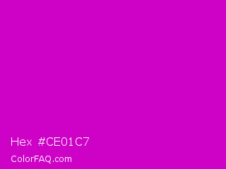Hex #ce01c7 Color is a normal magenta color and the nearest color is Deep Magenta #cc00cc. Hex code #ce01c7 and RGB value is rgb(206,1,199). In RGB color space, this color is composed of 81% red, 0% green, 78% blue, In CMYK color space, this color is composed of 0% cyan, 100% magenta, 3% yellow , 19% black , In HSL color space, this color has a hue angle of 302° , 99% saturation and 41% lightness.