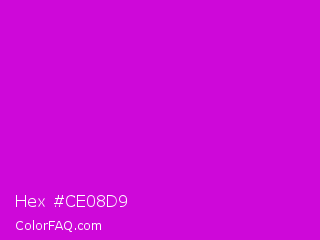 Hex #ce08d9 Color is a normal magenta color and the nearest color is Deep Magenta #cc00cc. Hex code #ce08d9 and RGB value is rgb(206,8,217). In RGB color space, this color is composed of 81% red, 3% green, 85% blue, In CMYK color space, this color is composed of 5% cyan, 96% magenta, 0% yellow , 15% black , In HSL color space, this color has a hue angle of 297° , 93% saturation and 44% lightness.