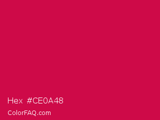 Hex #ce0a48 Color is a normal rose color and the nearest color is Spanish Carmine #d10047. Hex code #ce0a48 and RGB value is rgb(206,10,72). In RGB color space, this color is composed of 81% red, 4% green, 28% blue, In CMYK color space, this color is composed of 0% cyan, 95% magenta, 65% yellow , 19% black , In HSL color space, this color has a hue angle of 341° , 91% saturation and 42% lightness.