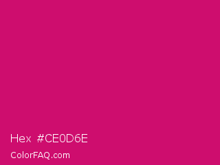 Hex #ce0d6e Color is a normal rose color and the nearest color is Dogwood Rose #d71868. Hex code #ce0d6e and RGB value is rgb(206,13,110). In RGB color space, this color is composed of 81% red, 5% green, 43% blue, In CMYK color space, this color is composed of 0% cyan, 94% magenta, 47% yellow , 19% black , In HSL color space, this color has a hue angle of 330° , 88% saturation and 43% lightness.