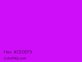 Hex #ce0ef9 Color is a normal purple color and the nearest color is Vivid Orchid #cc00ff. Hex code #ce0ef9 and RGB value is rgb(206,14,249). In RGB color space, this color is composed of 81% red, 5% green, 98% blue, In CMYK color space, this color is composed of 17% cyan, 94% magenta, 0% yellow , 2% black , In HSL color space, this color has a hue angle of 289° , 95% saturation and 52% lightness.