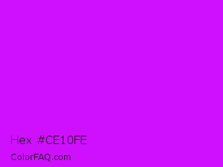 Hex #ce10fe Color is a normal purple color and the nearest color is Vivid Orchid #cc00ff. Hex code #ce10fe and RGB value is rgb(206,16,254). In RGB color space, this color is composed of 81% red, 6% green, 100% blue, In CMYK color space, this color is composed of 19% cyan, 94% magenta, 0% yellow , 0% black , In HSL color space, this color has a hue angle of 288° , 99% saturation and 53% lightness.