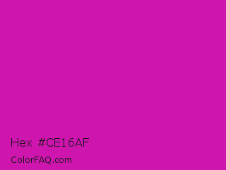 Hex #ce16af Color is a normal magenta color and the nearest color is Byzantine #bd33a4. Hex code #ce16af and RGB value is rgb(206,22,175). In RGB color space, this color is composed of 81% red, 9% green, 69% blue, In CMYK color space, this color is composed of 0% cyan, 89% magenta, 15% yellow , 19% black , In HSL color space, this color has a hue angle of 310° , 81% saturation and 45% lightness.