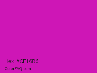 Hex #ce16b6 Color is a normal magenta color and the nearest color is Deep Magenta #cc00cc. Hex code #ce16b6 and RGB value is rgb(206,22,182). In RGB color space, this color is composed of 81% red, 9% green, 71% blue, In CMYK color space, this color is composed of 0% cyan, 89% magenta, 12% yellow , 19% black , In HSL color space, this color has a hue angle of 308° , 81% saturation and 45% lightness.