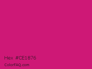 Hex #ce1876 Color is a normal rose color and the nearest color is Magenta Dye #ca1f7b. Hex code #ce1876 and RGB value is rgb(206,24,118). In RGB color space, this color is composed of 81% red, 9% green, 46% blue, In CMYK color space, this color is composed of 0% cyan, 88% magenta, 43% yellow , 19% black , In HSL color space, this color has a hue angle of 329° , 79% saturation and 45% lightness.