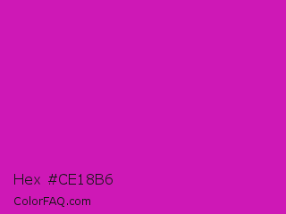 Hex #ce18b6 Color is a normal magenta color and the nearest color is Deep Magenta #cc00cc. Hex code #ce18b6 and RGB value is rgb(206,24,182). In RGB color space, this color is composed of 81% red, 9% green, 71% blue, In CMYK color space, this color is composed of 0% cyan, 88% magenta, 12% yellow , 19% black , In HSL color space, this color has a hue angle of 308° , 79% saturation and 45% lightness.