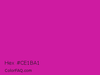 Hex #ce1ba1 Color is a normal magenta color and the nearest color is Royal Fuchsia #ca2c92. Hex code #ce1ba1 and RGB value is rgb(206,27,161). In RGB color space, this color is composed of 81% red, 11% green, 63% blue, In CMYK color space, this color is composed of 0% cyan, 87% magenta, 22% yellow , 19% black , In HSL color space, this color has a hue angle of 315° , 77% saturation and 46% lightness.