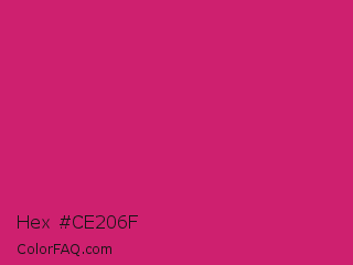 Hex #ce206f Color is a normal rose color and the nearest color is Magenta Dye #ca1f7b. Hex code #ce206f and RGB value is rgb(206,32,111). In RGB color space, this color is composed of 81% red, 13% green, 44% blue, In CMYK color space, this color is composed of 0% cyan, 84% magenta, 46% yellow , 19% black , In HSL color space, this color has a hue angle of 333° , 73% saturation and 47% lightness.