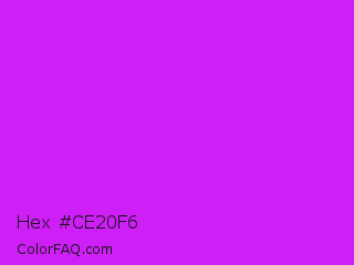 Hex #ce20f6 Color is a normal purple color and the nearest color is Vivid Orchid #cc00ff. Hex code #ce20f6 and RGB value is rgb(206,32,246). In RGB color space, this color is composed of 81% red, 13% green, 96% blue, In CMYK color space, this color is composed of 16% cyan, 87% magenta, 0% yellow , 4% black , In HSL color space, this color has a hue angle of 289° , 92% saturation and 55% lightness.
