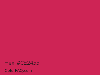 Hex #ce2455 Color is a normal rose color and the nearest color is Rose Red #c21e56. Hex code #ce2455 and RGB value is rgb(206,36,85). In RGB color space, this color is composed of 81% red, 14% green, 33% blue, In CMYK color space, this color is composed of 0% cyan, 83% magenta, 59% yellow , 19% black , In HSL color space, this color has a hue angle of 343° , 70% saturation and 47% lightness.