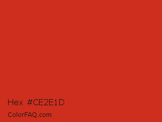 Hex #ce2e1d Color is a normal red color and the nearest color is Vermilion #d9381e. Hex code #ce2e1d and RGB value is rgb(206,46,29). In RGB color space, this color is composed of 81% red, 18% green, 11% blue, In CMYK color space, this color is composed of 0% cyan, 78% magenta, 86% yellow , 19% black , In HSL color space, this color has a hue angle of 6° , 75% saturation and 46% lightness.